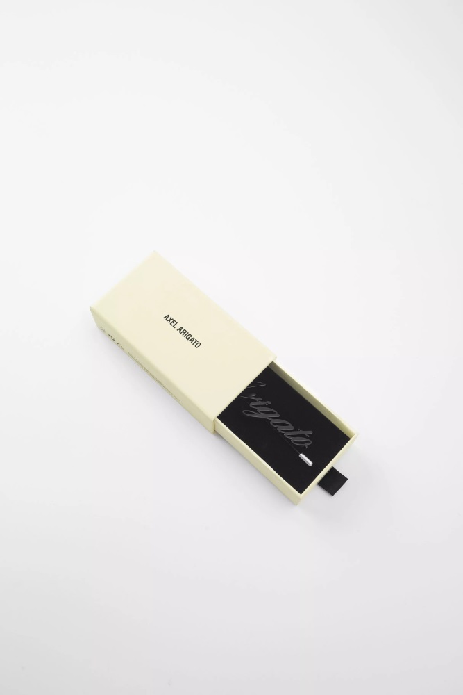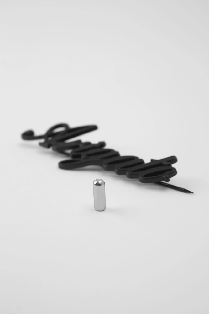 Der Arigato-Stift Ist In Unser Charakteristisches Kursives Logo Geformt. Es Besteht Aus Farbig Beschichtetem Metall Und Ist An Einer Schmalen Stange Befestigt, Die An Kleidung Oder Accessoires Befestigt Werden Kann.