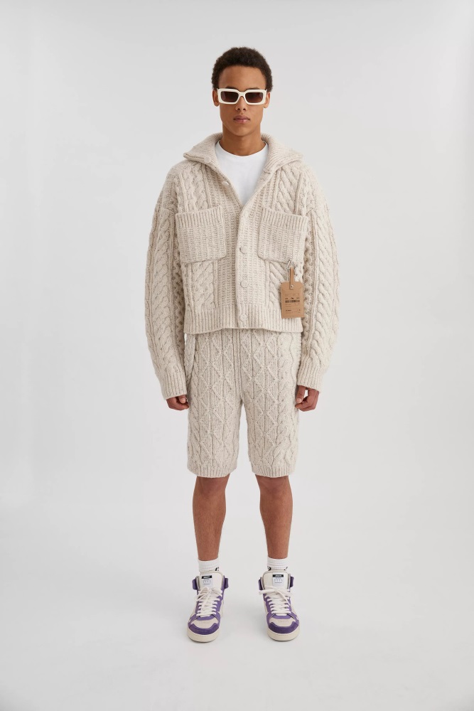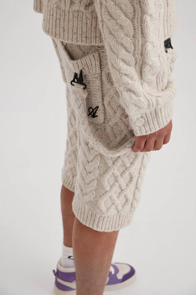 Die Neps Shorts Präsentieren Eine Klobige Kabelstruktur Mit Zusätzlichen Skate-inspirierten Merkmalen Eines Schlüsselbunds Mit Metallschnallen. Die Shorts, Gestrickt Aus Zweifarbigem Effekt-noppengarn, Sind Mit Seiten- Und Gesäßtaschen Gestaltet. Die Silhouette Der Shorts Bezieht Sich Auf Die Erinnerungen An Unsere Kindheit Und Den Prozess Des Heraus- Oder Hineinwachsens. Wolle Ist Ein Flauschiges Material, Was Bedeutet, Dass Sie Fusseln Kann. Versuchen Sie In Diesem Fall, Das Pilling Mit Einem Wollkamm Zu Entfernen. Toumane Ist 186 Cm Groß Und Trägt Größe M.