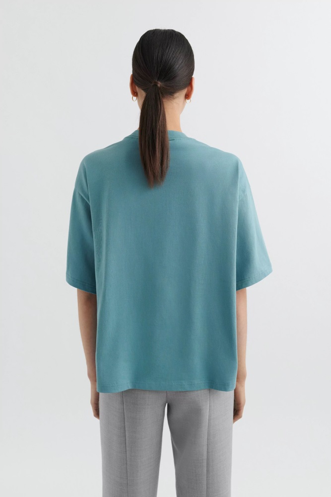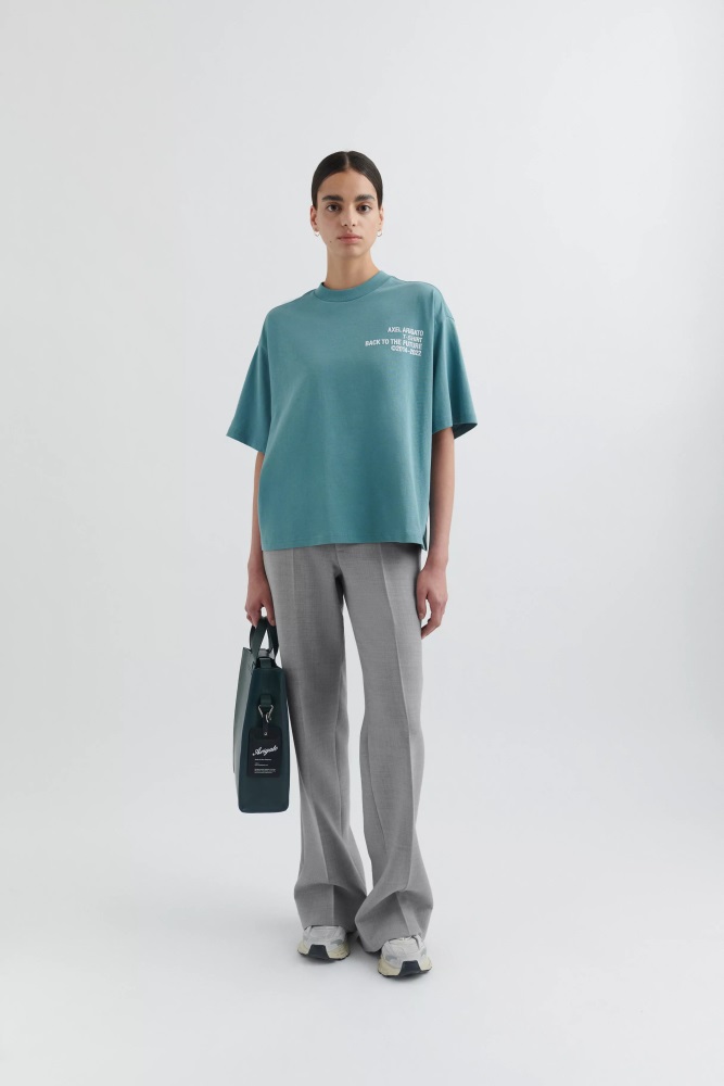 Das Era T-shirt Mit Rundhalsausschnitt Ist Aus Gots-zertifizierter Bio-baumwolle Geschnitten. Es Ist Mit Einem Beflockten Logo Und Dem Charakteristischen „Zurück In Die Zukunft“-Slogan Auf Der Vorderseite Versehen. Paulina Ist 180 Cm Groß Und Trägt Größe S.