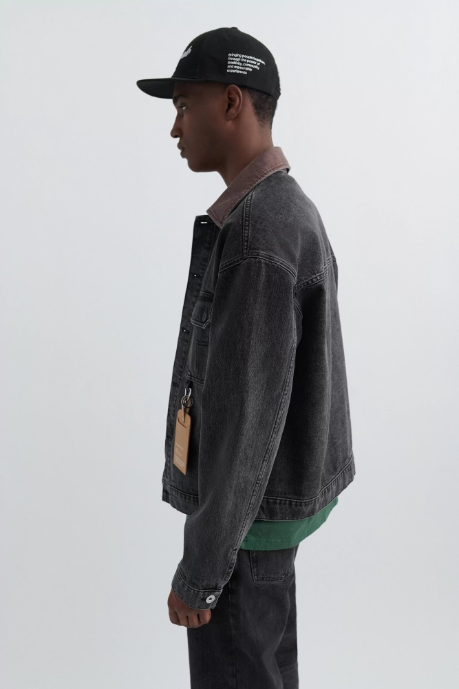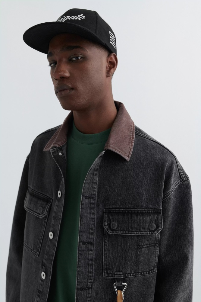 Die Aus Teilweise Recyceltem Baumwoll-Denim Geschnittene Weste Erinnert An Klassische Western-Styles. Es Hat Einen Kontrastierenden Kragen Und Pattentaschen Auf Der Brust – Die Linke Hat Darunter Eine Schlaufe Mit Unserem Charakteristischen Gepäckanhänger. Diogo Ist 187 Cm Groß Und Trägt Größe M.