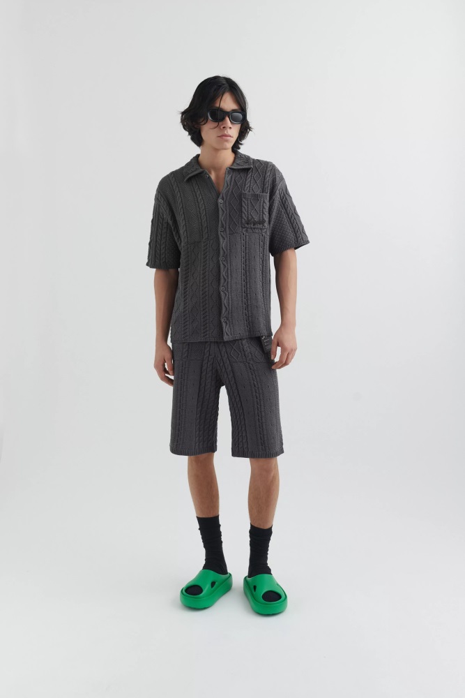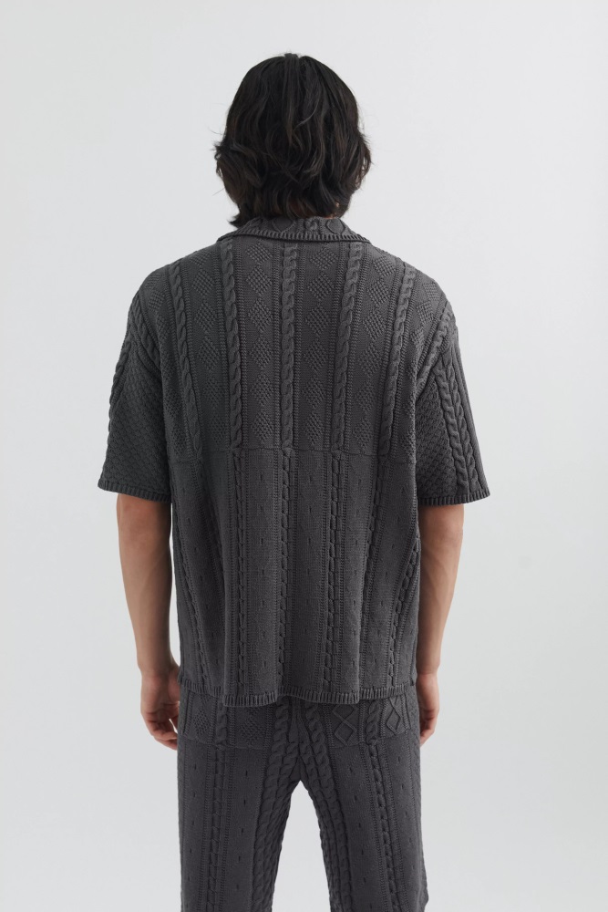 Das Sonic Shirt Wird Aus Einer Baumwollmischung Mit Einer Kombination Von Stichen Gestrickt, Die In Größe Und Textur Variieren. Es Hat Ein Button-Down-Profil Mit Kragen Und Ist An Der Brusttasche Mit Einer „Arigato“-Nadel Verziert. Dieses Hemd Hat Eine Normale Passform. Eduards Ist 191 Cm / 6'3 Ft Groß Und Trägt Größe M.