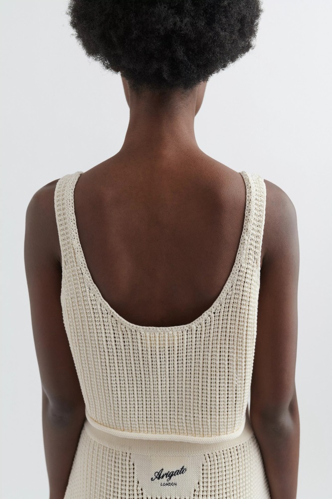 Das Netz-tanktop Ist Aus Weicher Baumwolle In Einer Verkürzten Silhouette Gestrickt. Es Hat Schmale Schulterträger Und Einen Dezent Gerollten Saum. Kontrastierende „Arigato“-Stickereien Runden Dieses Stück Ab. Jennifer Ist 176 Cm Groß Und Trägt Größe S.