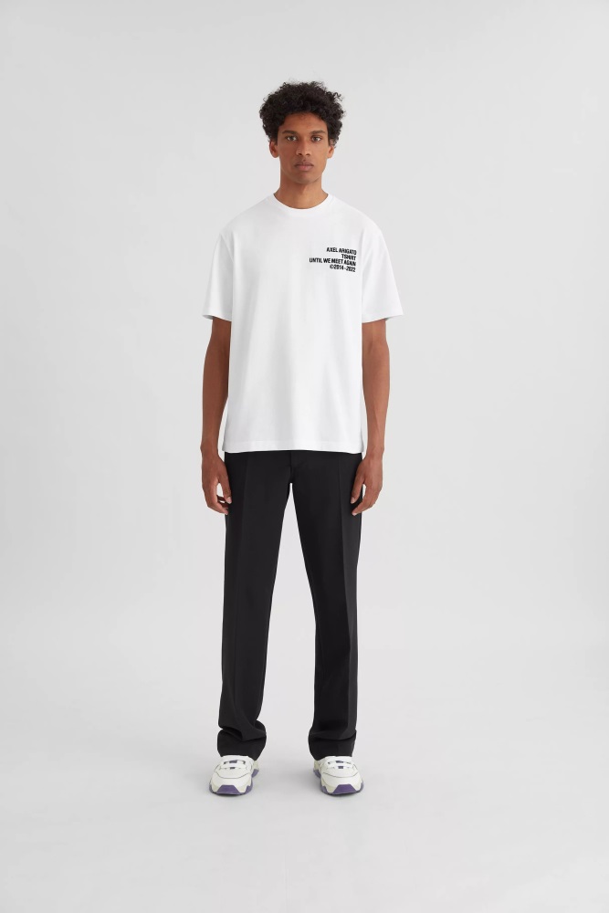 Das Escape Axel T-Shirt Ist Aus Gots-zertifizierter Bio-Baumwolle Geschnitten Und Hat Einen Klassischen Rundhalsausschnitt, Der Bequem Sitzt. Es Ist Mit Einem Beflockten Logo Und Den Worten „until We Meet Again“ Versehen. Vincent Ist 186 Cm Groß Und Trägt Größe M.